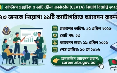 কাস্টমস এক্সাইজ ও ভ্যাট ট্রেনিং একাডেমি (CEVTA) নিয়োগ বিজ্ঞপ্তি ২০২৬ আপডেট। ১১টি ক্যাটাগরিতে ২৩ জনকে নিয়োগ দেওয়া হবে। আবেদনের নিয়ম ও বিস্তারিত তথ্য এখানে।