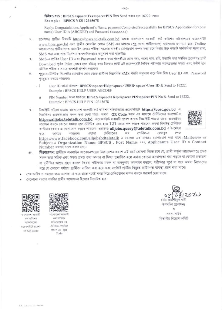 - আবেদন সাবমিট করার পর একটি User ID পাবেন। এটি ব্যবহার করে ৭২ ঘণ্টার মধ্যে টেলিটক সিমের মাধ্যমে আবেদন ফি জমা দিতে হবে।